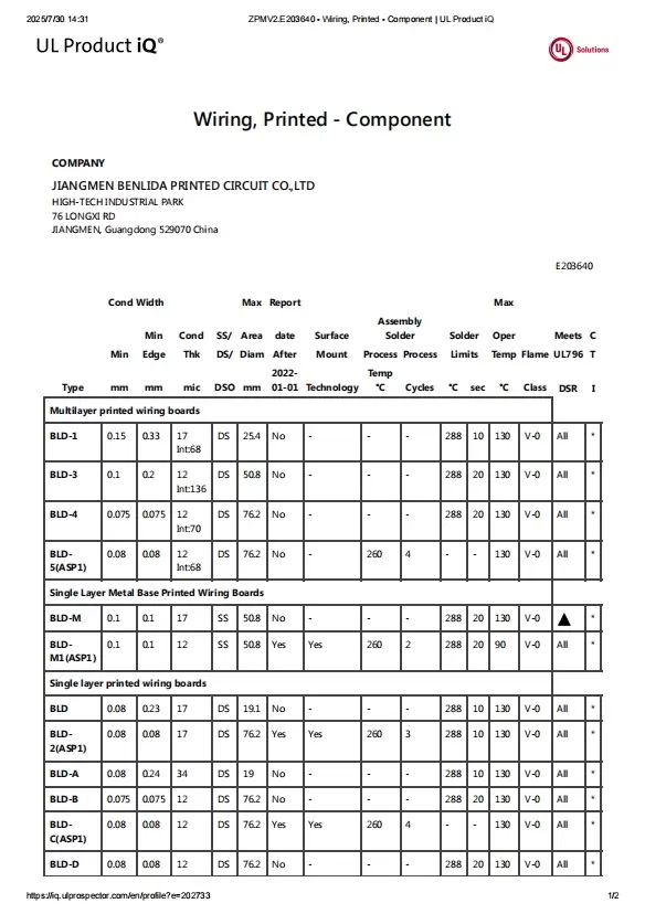 We hold UL certification for single-layer metal base printed wiring boards (BLD-M1 series), in full compliance with UL 796 and related standards.
